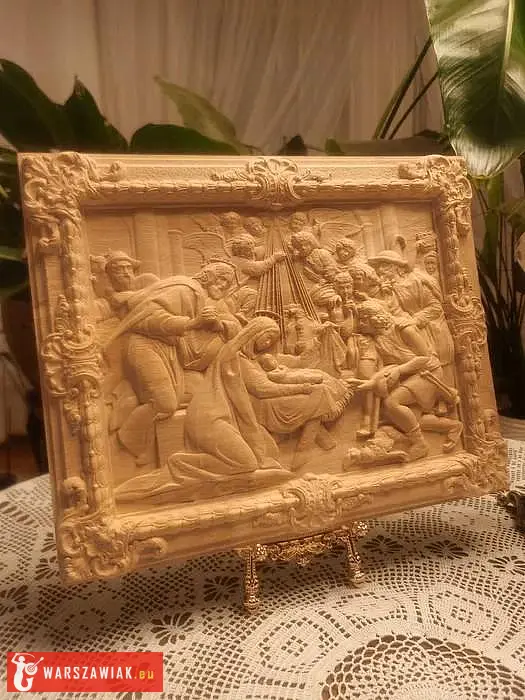 Arcydzieło sztuki snycerskiej w formie panelu reliefowego, przedstawiające pełną mistycyzmu scenę Narodzenia Pańskiego. Kompozycja ukazuje Świętą Rodzinę w otoczeniu aniołów oraz pasterzy przybyłych oddać pokłon nowo narodzonemu Dzieciątku. To bogate w treść duchową dzieło stanowi centralny punkt każdej kolekcji o charakterze religijnym, łącząc w sobie głębię przekazu z najwyższą dbałością o detale historyczne i artystyczne.